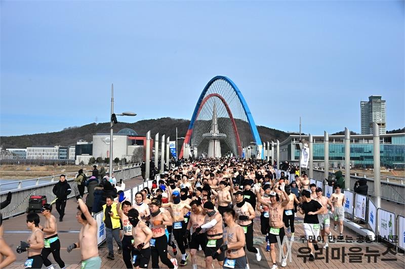 <새해 첫날 알몸으로 '2026선양맨몸마라톤 대회' 출발하는 마라톤 선수들 달리는 모습> 2026년 병오년 붉은 말의해 첫날 국내 이색 이벤트로 박종훈MC 사회로 대전엑스포과학공원 물빛광장에서 '2026선양맨몸마라톤 대회'가 진행되었다. (주)선양소주(대표 조웅래, 김규식)가 주최 및 주관하여 2016년 시작하