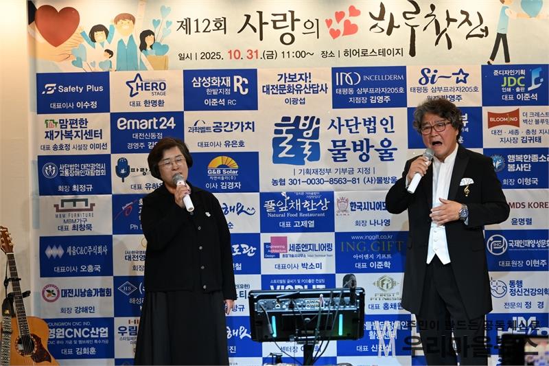 사랑의 물방울(이사장 이준석)에서 10월 31일(금) 오전 11시부터 서구 둔산동 히어로스테이지(대표 한명환)에서 '제12회 사랑의 하루찻집'을 개최했다. 이번 행사는 한명환 가수의 사회로 오전과 정오, 오후 3차례 공연으로 마지막에는 테너 강항구 부부과 멋진 공연으로 함께하신 후원자분들과 회원들에게 큰 박수를 받았다.