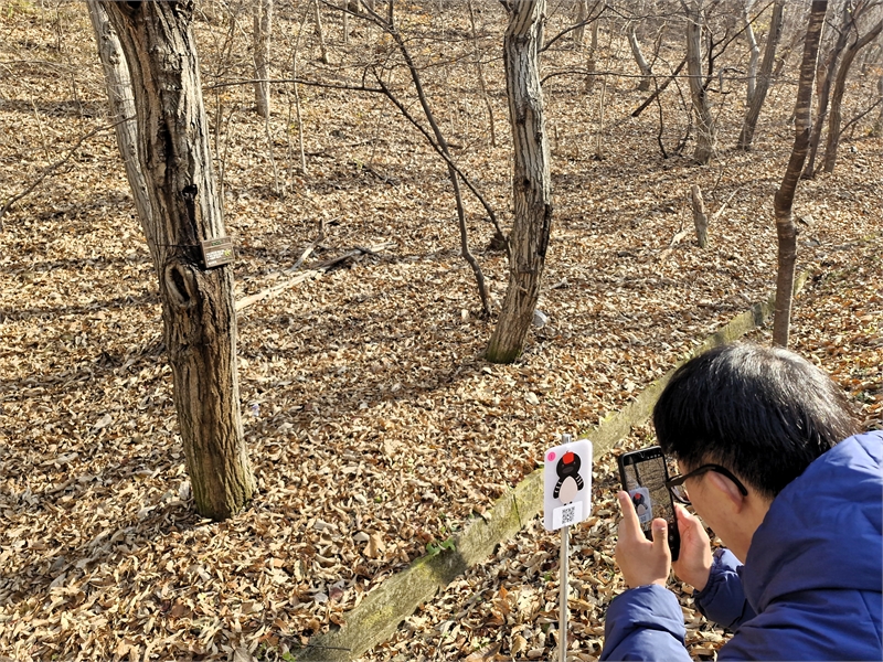 소형QR마크해설판을 따라 '국민의 숲'의 숲이야기를 탐구하는 발달장애인